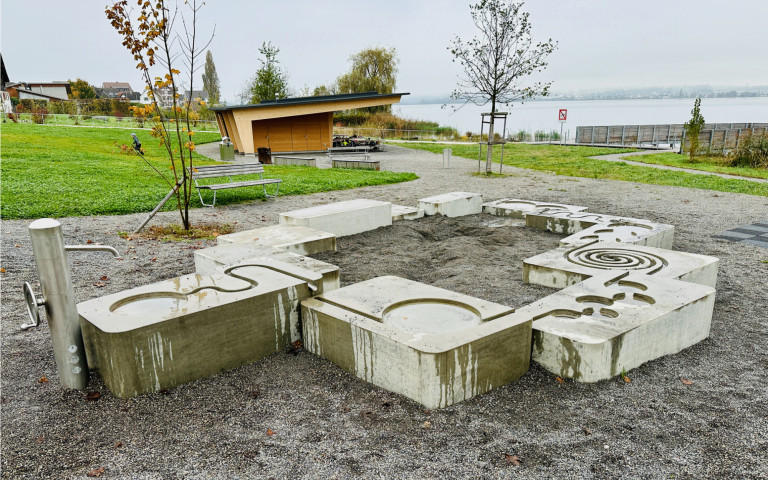 Wasserspiel aus gegossenen Betonblöcken mit eingeformtem Wasserlauf, Mäander, Wirbelbecken und Spirale. Zum Experimentieren, Stauen, Matschen und Beobachten.