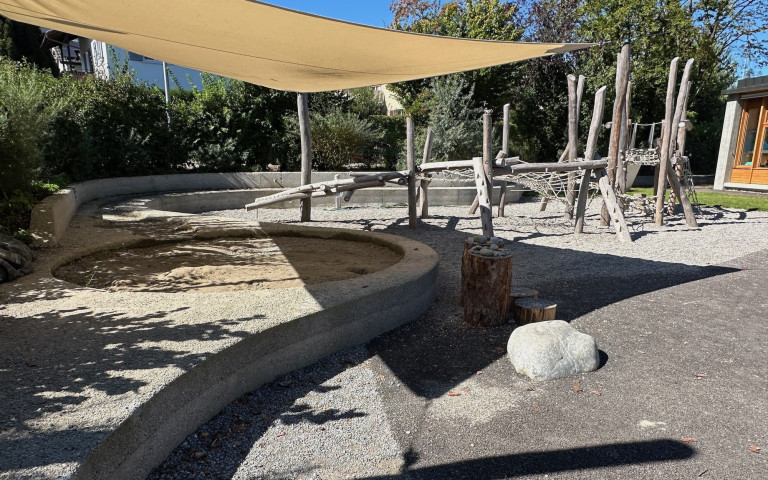 Die Kletterstruktur aus Robinienholz bildet das Gerüst des Kletterdrachens. Seilarbeiten wie zum Beispiel Lümmel- und Aufstiegsnetze sowie ein grosses Spinnennetz mit diversen Aufgängen fachen den Körper aus. Die gemütliche Sitzrunde mit Tischchen unter dem Kiefer-Podest laden zum Picknicken ein. Durch's Maul, lässt es sich die Zunge runterrutschen.