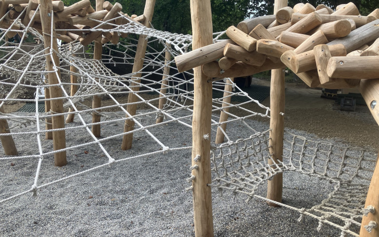 Grosse Spielanlage mit unterschiedlichen Herausforderungen für Gross und Klein. Kletterstruktur mit strubbeligen Holznestern, niedere Aufenthaltsstruktur zum Sitzen, Balancieren, Plaudern und Picknicken. Wasserspiel mit geschnitztem mäandrierendem Wasserkanal und Matschtisch. Schaukeln und Hügelrutschbahn.